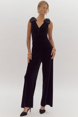 Solid v-neck sleeveless velvet wide leg jumpsuit featuring sequin embellish bow at shoulder. Back zipper closure. Lined. Knit. Non-sheer. Lightweight.