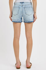 Tummy control denim shorts in a light wash with a released style hem along the bottom.