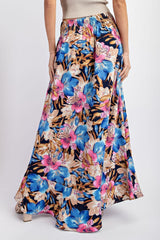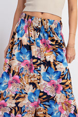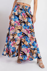 Floral printed maxi skirt featuring a smocked waistline, a faux button down front creating a front slit, a ruffled bottom and is a lightweight, flowy fabrication.