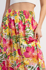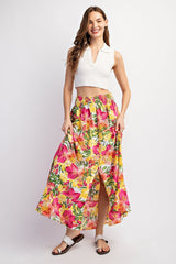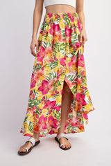 Floral printed maxi skirt featuring a smocked waistline, a faux button down front creating a front slit, a ruffled bottom and is a lightweight, flowy fabrication.