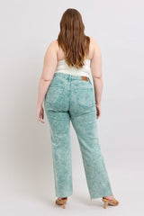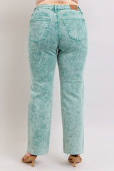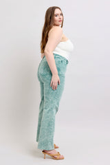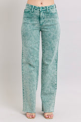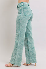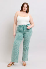 Sage colored, mineral washed jean by Judy Blue. These have a high rise fit, raw hemline and relaxed/wide leg fit.
