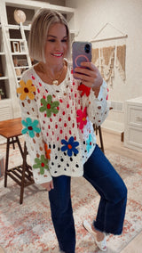 Super fun sweater with perforated detailing, floral patches and relaxed style fit.