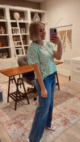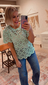Adorable light mint colored crochet top with short sleeves. Style over a mint, nude or white cami and this styles great with denim or white bottoms.