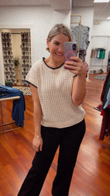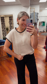 This sweater has short sleeves, a crew neckline and runs true to size.