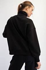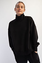 Sleek pullover made with a silky smooth, lightweight, and breathable material. Features a mock neck, sleeve cuffs, and a rib contrast detail hemline finish. Long sleeve relaxed fit top with a ribbed turtle neck look.