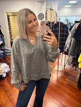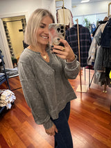 A fall just have: this light weight long sleeved top has an all over acid wash look and come in three color options. This top has a v-neckline, exposed seams and styles great with denim or leggings