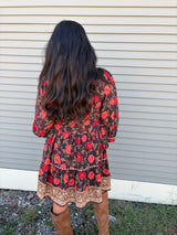 Step into fall read to turn heads in this button up floral print dress. This has a relaxed fit and adorable tie details on the side.