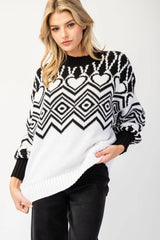 This sweater has such an endearing look. Has a geometric heart print with long sleeves, featuring a ribbed round neckline, ribbed cuffs, a ribbed bottom band and is a slight oversized fit.