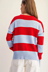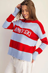 This bold striped sweater features wide red and light blue bands with a crew neckline, ribbed cuffs and hem with side slits, and a playful "APRES SKI" intarsia graphic across the chest for a sporty winter ready look.