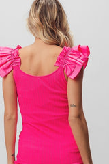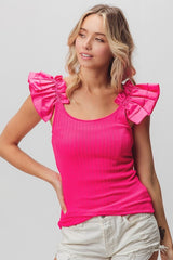 The Britt Ruffled Tank comes in black or fuchsia.  This one has a ruffled shoulder detail with a textured bodice.  This fun little tank stand out on it's own styled with jeans, or looks great tucked into your favorite printed bottom or skirt.