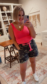 Camo print shorts with a fun bright pink drawstring. These have a high rise fit, braided waist belt and raw hemline.