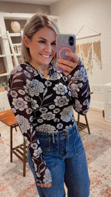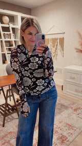 Floral mesh top with a mix of black and white. This shirt has a lot of stretch and styles great with jeans, white or black bottoms. This top is lined.