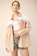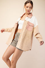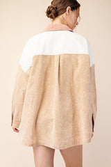 Mineral washed color block jacket featuring a button down front, a collared neckline, two chest pockets, buttoned cuffs and an added pleat in the back for detail.