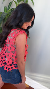 This gorgeous top comes in white or coral.  Style with a crop top, tank top or bodysuit underneath.