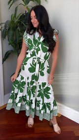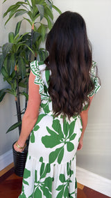 This stunning dress has an ivory and green floral print with ruffled sleeves, a tiered style fit and an elastic waist.