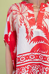 Red and ivory tropical printed top with a relaxed style fit. Style with the coordinating bottoms or white denim.