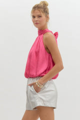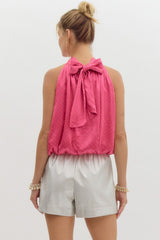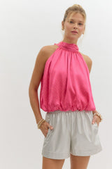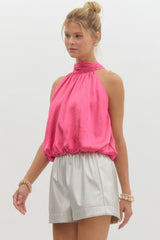 Solid hot fix rhinestone halter neck balloon top featuring self-tie closure detail at back neck. Lined. Woven. Non-sheer. Lightweight.