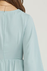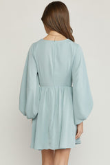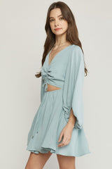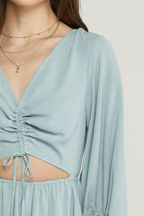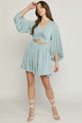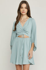 Solid v-neck long sleeve dress featuring cut out at waist. This flirty dress comes in this perfect seafoam color.