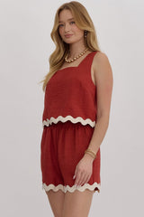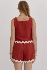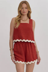Shorts: Solid square neck cropped top featuring ric rac trim. Lined. Woven. Non-sheer. Lightweight